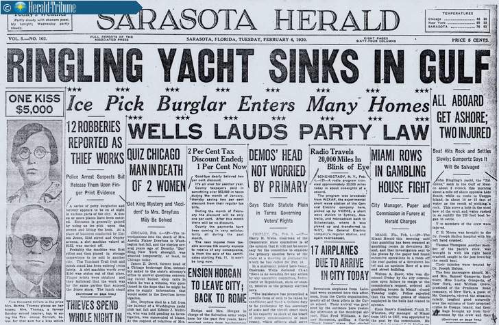 Ringling's luck fared poorly afloat By JEFF LAHURD. Correspondent SARASOTA - For all of his success on land, John Ringling had a singular run of bad luck when it came to his seafaring vessels. The sleek 83-foot Wethea was replaced by the larger and more opulent, Vidoffner II. Captained by the “genial” Arthur Rowe with a crew of eight, it was hailed by the Sarasota Times as “one of the finest boats that has been seen in these waters for many a day.” At 110 feet long the ship was lavishly appointed with all that era's luxuries, including a music room with an electric player-piano, electric lighting, a telephone in the guest rooms, a fully outfitted kitchen with a refrigerator that could hold 1,800 pounds of ice, and a dumbwaiter that brought gourmet meals up to the dining room, “thus eliminating any odor from the kitchen.” The bedroom closets were “moth proof.” For show, up to 1,500 electric globe lights could be switched on for an impressive seaside display. The Sarasota Times reported that the boat was so magnificent, “that anyone could well feel proud over the ownership.” Ringling's yachts, each grander than the one before, were more than obvious status symbols of his wealth and social standing. They also provided a prestigious means of showcasing the area to his high-brow friends and prospective property buyers. It was easy to reel in fish, one after the other, when the bay literally teemed with them, followed by a scrumptious meal and convivial company, and a cocktail or two with the great man himself. Salesmanship at its subtle best. The Sarasota Herald wrote of one such outing that the guests were treated to “waters of the bay and gulf assuming every color known to marine painters.” The trip offered “a day's pleasure such is rare even in Florida, land of pleasure seekers.” On Feb. 13, 1920, while in Tampa to undergo general repair and to take on new engines, the Vidoffner II exploded while being refueled, and sank. One crew member was severely burned and another was killed. According to Ringling biographer, David C. Weeks, after the Vidoffner went down, Ringling leased the yacht Pastime from John Wanamaker. As the bay waters near Ringling's home were too shallow to accommodate it, the boat was docked in front of the Sarasota Yacht and Automobile Club on Gulf Stream Avenue — which Ringling owned — or at the nearby city pier. It was from the Pastime he modeled his next vessel, the 125-foot Zalophus. As Week's put it, “Zalophus was the ultimate symbol of John Ringling's success. It resembled John Wanamaker's Pastime of Palm Beach — in other words, it was a duplicate of a boat owned by a man of great wealth and social position.” In “Ringling, The Florida Years,” Weeks added that the Zalophus was the last word in sea-going luxury. The ship, completed in December 1922, contained six state rooms and quarters for the servants and crew. Ringling reportedly paid $200,000 for it, more than $2.5 million in today's currency.