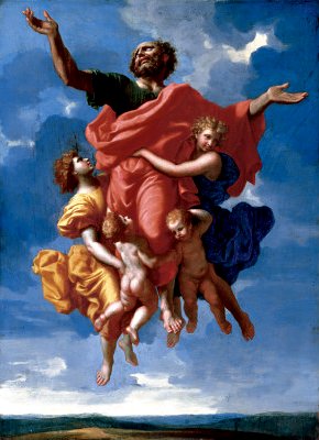 Notable works included The Seven Sacraments, with contrasts of light and dark ; Dance to the Music of Time, in which Music, Poetry, and Dance were brought together in a painting ; Landscape with Diogenes which gives an expression of mood in which the harmony of nature and the virtue of man are explored. Landscapes are presented as if they were architectural constructions, with clearly defined planes within a finite enclosed space. During the 1650's Poussin's depiction of religious subject matter became more poignant and his capacity to go to the heart of the subject matter reached a new level of intensity. The Ringling Holy Family, for example, is the most grandiose and severe in conception of all of the Holy Families he painted. This maniera magnifica or magnificent style lasted from about 1655 to his death some ten years later. Subject: In this painting we see an interpretation of the ecstatic vision of St. Paul which he describes in Corinthians ( II Corinthians 12: 2-4). "I knew a man in Christ above fourteen years ago (whether out of the body I cannot tell: God knoweth;) such a one caught up to the third heaven . . . How he was caught up into paradise and heard unspeakable words, which it is not lawful for a man to utter". Painting: We see St Paul lifted against a stormy sky by two adult angels and two putti. The angel on the right is wearing a dark blue gown, the one on the left is draped in gold. The saint wears a flaming red mantle over a dark green tunic which provides a fresh contrast with the blue sky that seems to glow with a mystical light. The billowing draperies of the angels creates a sensation of upward lift. St Paul flings his arms out and throws back his head in rapture, giving us the feeling that his frail physical body can tolerate no more of the glorious vision that has been granted him. The distant landscape at the bottom of the painting takes us up to a dizzying height and gives the figures almost superhuman scale as they fill the small space of the panel. The ground below is shown as only the narrowest band of land. Historical Context: Painted during the time of the Counter Reformation, this painting fit well with the aims of the Catholic Church which utilized mystery as well as martyrdom in art to impress the faithful and bring them back to the church and away from the heretical Protestant Reformation. |