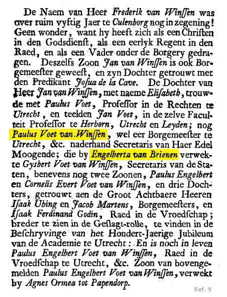 Paul Voet van Winssen, gedoopt te Utrecht 4 Febr. 1651, zoon van Paulus Voet en Elisabeth van Winssen. Hij studeerde te gelijk met zijn broeder Johannes Voet in Frankrijk, en werd burgemeester van Utrecht, secretaris van de Staten van Utrecht, de gedeputeerden en de ridderschap, en griffier van de leenen. Lees oude publikatie hier.
