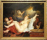 ARTIST: At 23 he went to Italy, becoming court painter to the Duke of Mantua. With his reputation made, he returned to Antwerp where he maintained a large studio of assistants and collaborators, among whom were Van Dyck and Jordaens. His ruler, Isabella Clara Eugenia, was his loyal patron for whom he undertook many diplomatic missions. Rubens’ private life was equally successful. At 32 he married Isabella Brant, a lush 17-year-old Flemish girl with whom he had 2 children. Their home was a remodeled palace in which they entertained royally, but otherwise lived temperately. Rubens’ typical day included mass at 4 a.m. Then he painted through the good light, followed by time outdoors with his horses and children. At night he discussed affairs of state with visiting dignitaries, or did his writing. After Isabella’s death, Rubens remained a widower for 4 years, then married the most beautiful girl in Antwerp. He was 52, she was 16. They retired to a new country home where he fathered 4 more children and spent 10 happy years before his death. Rubens celebrated each of his 2 marriages with beautiful family portraits. He kept his studio busy for 15 years, turning out some 3000 paintings. Meanwhile he wrote books on architecture and gems, and served his ruler well in government. Talented, genial, and honest, he was truly a man for all seasons! SUBJECT: The story comes from mythology. King Acrisius of Argos had a beautiful daughter, Danae. When it was prophesied that a son of hers would kill him, the distraught father imprisoned her in a bronze chamber underground in an effort to forestall a marriage and eventual childbirth. However, that well-known seducer Zeus transformed himself into a shower of gold coins which slid into her chamber. As a result of that encounter, Danae bore a son, Perseus, who did indeed fulfill the prophecy, albeit accidentally. Years later in an athletic contest, Perseus’ discus swerved into the crowd of spectators, striking a fatal blow to Acrisius. PAINTING: The figure of Danae also appears in Rubens’ Abduction of the Daughters of Leucippas…..a good example of transferring a design from one painting to another.