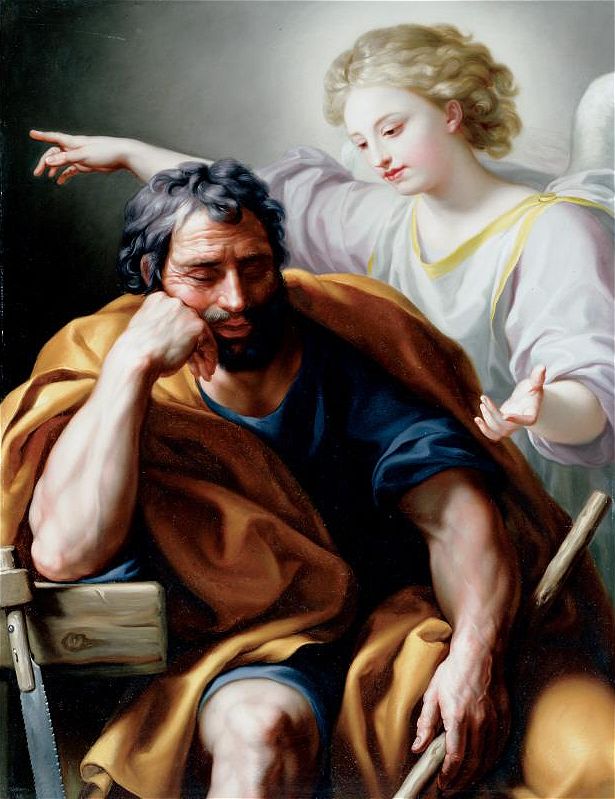 Our painting illustrates the Book of Matthew, 2:13, where a dreaming Joseph is directed by an angel to take his family and flee into Egypt.