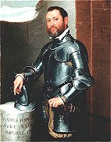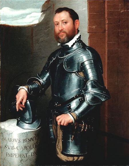 ARTIST: A provincial painter, Moroni seems to have devoted his talents principally to portraiture. According to Moroni’s 1st biographer, Carlo Ridolfi, writing in 1648, Moroni’s skill as a portraitist was highly esteemed by his contemporaries. The painter Titian supposedly recommended to Venetian officials traveling to Bergamo that they have their portraits painted by Moroni because of the naturalism of his style. He also received commissions for religious paintings. SUBJECT: Following the example of his older brother, Ettore, Mario enlisted in military service under the Holy Roman Emperor, Charles V. Mario fought against both the Protestant princes of the Schmalkaldic League in Germany in the battle of Muhlberg (1547), and the French troops in the war in Piedmont (1551-1555). In 1556, Charles V abdicated; Mario, who had attained the rank of captain, probably gave up his military career at that time. His family, among the richest & most influential in Crema, was also notorious for acts of violence & evil deeds. In 1537, e.g., brother Ettore killed 2 adversaries in one year; at the same time, their father, Agostino, was imprisoned in a Venetian jail. Ettore died a violent death in 1574, as did his son Maurizio, whose life had been equally wicked. It is not surprising, therefore, that Mario preferred to retire at first to Crema, rather than Bergamo where the family reputation was not good. However, documents show that Mario married Margherita Bonareni, a widow from Bergamo, & took over various properties of hers. He lived prosperously in Bergamo with his wife & 2 daughters, Nostra & Arpalice, until his death in 1596. PAINTING: