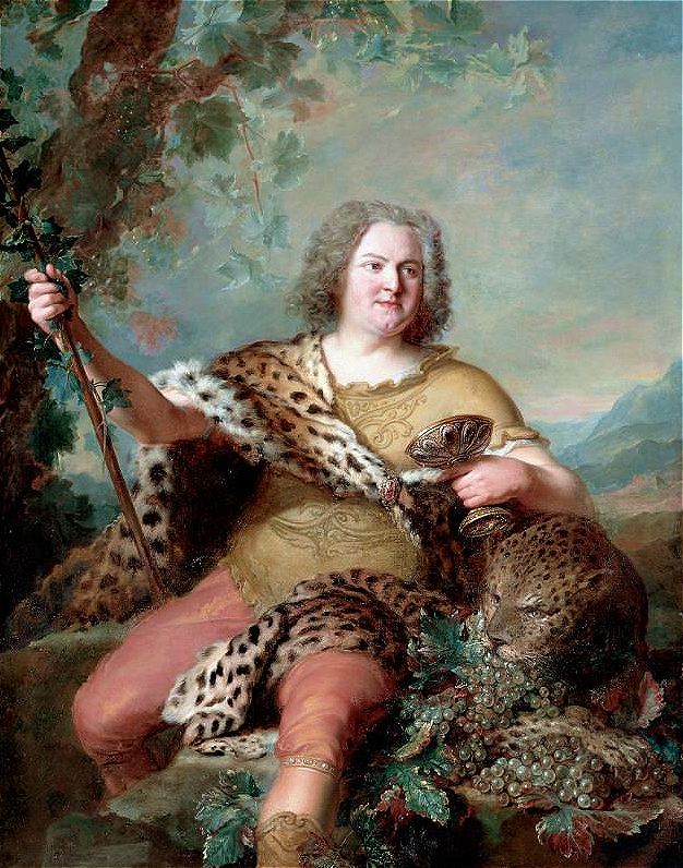 Is this a tongue-in-cheek portrait painted for the family salon? No…it’s typical of French court portraiture of the first half of the 18th century, during the reign of Louis XV. Portraits of the aristocracy playing at gods and goddesses or other classical characters were the rage. Here the sitter is portrayed as Bacchus, holding his cup of wine & his thyrsos (grapevine stock). In ancient times Bacchus was often portrayed in a chariot drawn by tigers, leopards, or goats. Thus we see the leopard lolling at the sitter’s side and looking out at the viewer.