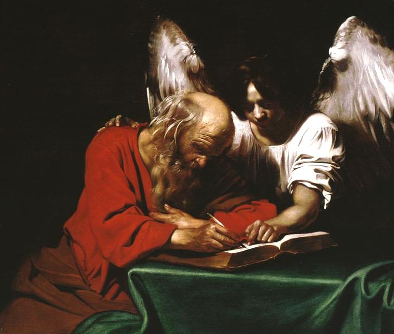The painting touches us with its intimacy: the angel’s right hand rests familiarly and affectionately upon the old man’s shoulder, while his left hand guides Matthew’s pen across the page, as if he were relaying divine inspiration and truth. Matthew’s brow wrinkles as he struggles to concentrate. The dark background thrusts the figures forward, toward the viewer. The light provides a tense, spotlighted performance.