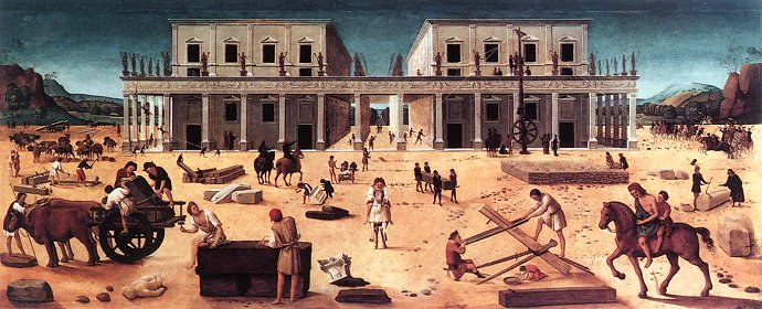 THE BUILDING OF A PALACE. By Esther Schuerman Artist -Piero di Cosimo was an unsalaried apprentice ofCosimo Rosselli. Roselli was summoned to Rome by Pope Sixtus IV, and Piero di Cosimo went with him and spent two years there. By the late 1480's, Piero di Cosimo was established as an independent artist in Florence as one of the most original and imaginative artists in that city. About half of his work consists of religious subjects. In addition, he painted portraits, made a significant contribution to landscape painting, was a marvelous painter of animals and is known for his mythological scenes and naturalistic style. His works were influenced by Leonardo da Vinci and Filippino Lippi and other contemporary artists, and his pupils included Andrea del Sarto. There are no signed, documented, or dated works by Piero de Cosimo. For centuries he was best known for his personal eccentricity. He was afflicted by partial paralysis which often prevented him from working, and he died in Florence in self-imposed solitude. Subject -There have been several differing opinions on what the subject matter is based. It may be part of a series of other works which depict important episodes from early history such as the "Golden Age". It has also been proposed that it may represent the origins of architecture or an allegory on the art of building. It does seem clear that the painting represents on ideal structure, not a real one. Painting -What we see in this painting is an accomplished example of Renaissance perspective painting, but we also see evidence ofPiero di Cosimo's inventive trend in the curious perspective of some of the figures and animals. The painting shows extensive space and a scattering of rather rigid, spindly figures. All kinds of activities associated with the building of a palace are depicted as numerous workmen are preparing for it's completion. We see the palace has two wings connected by columns and terraces. Statues similar to those in the Ringling Museum courtyard are lined around the roof line. Decorative landscapes are on either side of the building. On the right of the building, we see a group arriving on horseback, who are probably a ducal entourage. The painting has great aesthetic merit as well as being of cultural interest as an illustration of contemporary architectural procedures. Historic Context -The ideal beauty of classical art held a central place in society during the Italian Renaissance and was often seen through architecture's combination of philosophy, mathematics and archeology. Provenance -This painting was in the Emile Gavet collection in Paris. Later it was owned by William K. Vanderbilt and inherited by Mrs. Oliver Belmont of Newport, R.I. It was acquired by John Ringling through Duveen in London in 1928-1929. Bequest of John Ringling 1936.