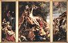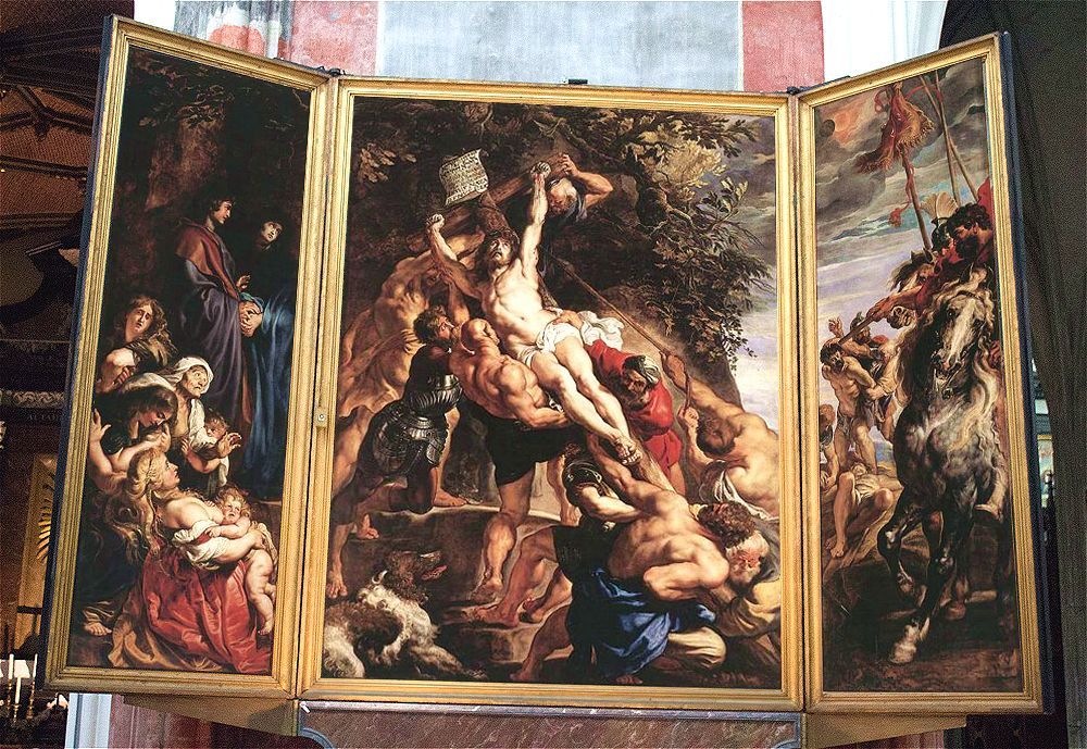 One other aspect stands out: their drinking habits. The pastor and his wife drank two bottles of wine (26 fl.oz), plus 35 bottles of beer (12 fl.oz) every week. That must have been quite normal or otherwise he would not have spelled it out to his congregation. What did painters earn? Top artists like Rembrandt received 500 guilders per painting, but for The Nightwatch (look here) he received 1,800 guilders ($108,000), because the 18 civic guards portrayed paid him 100 guilders each. But if a painter did not belong to the "crème de la crème", and with a mean value of 15 guilders ($900) for all paintings, it implies that a regular painter had to produce 1.5 paintings per week to reach an income of twice that of a master carpenter (after cost of materials and rent of a studio). Mixed in with this were apprentices, who copied their master's paintings. Two copies per week. Those copies were sold for 6 guilders a piece. But even with all those efforts many painters could not make a decent living. At the end of the 17th century, the average number of paintings per household varied between: Real estate prices (and rents) varied considerably, depending on location. Mortgage interest rates were only 2 - 3 %. What did Rubens earn? Rubens obtained his first big commission already one year after he came back home. It was the Raising of the Cross, a 21 x 10 ft triptych for the church of St. Walpurgis (now in the Cathedral of Antwerp) for 2,600 guilders ($150,000). Average prices for such a commission, until then, were usually 500 guilders ($30,000). It, at once, established Rubens as the leading master of the city.
