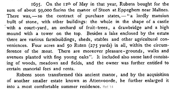 Five years later, at age 58, he bought another castle. A country estate, "Het Steen" in Elewijt, south of Antwerp, closer to Brussels. Rubens paid 93,000 guilders for it ($5.6 million). His beautiful townhouse in Antwerp seemed a 'minor' asset compared to his castle. Click pic on the left for slideshow of the estate.